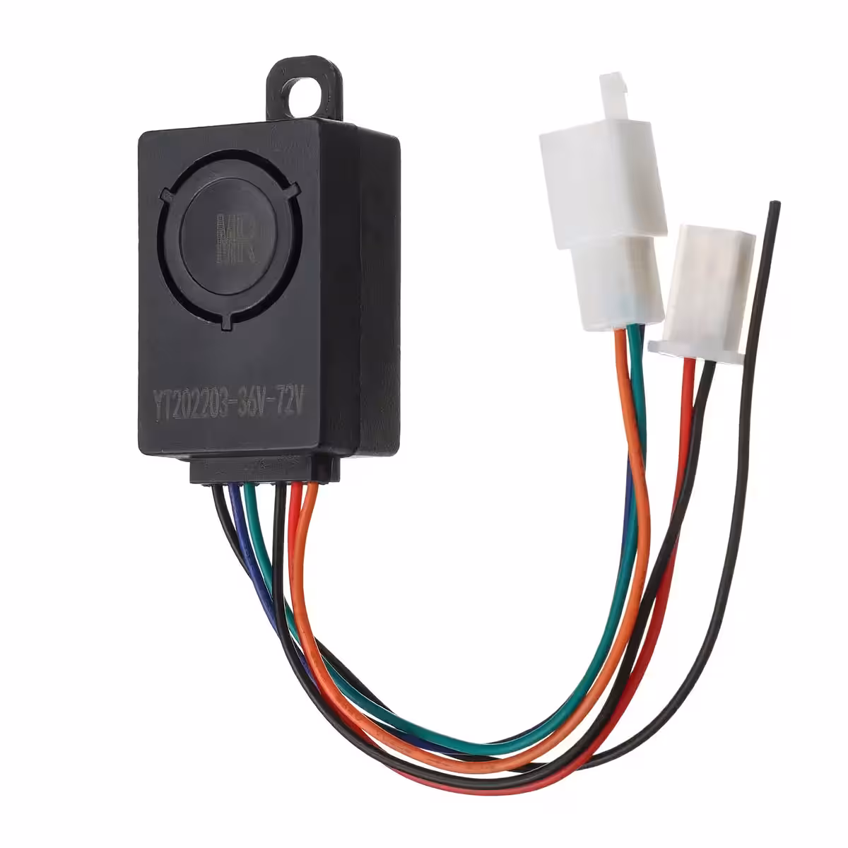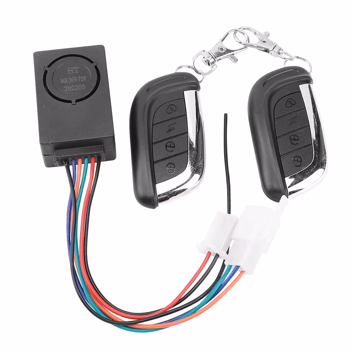 Pametni zaščitni sistem za skiroje, električna kolesa in skuterje 36V–72V. Alarm oddaja močan zvočni signal in vključuje daljinski upravljalnik za aktivacijo, deaktivacijo ter hitro lociranje vozila.