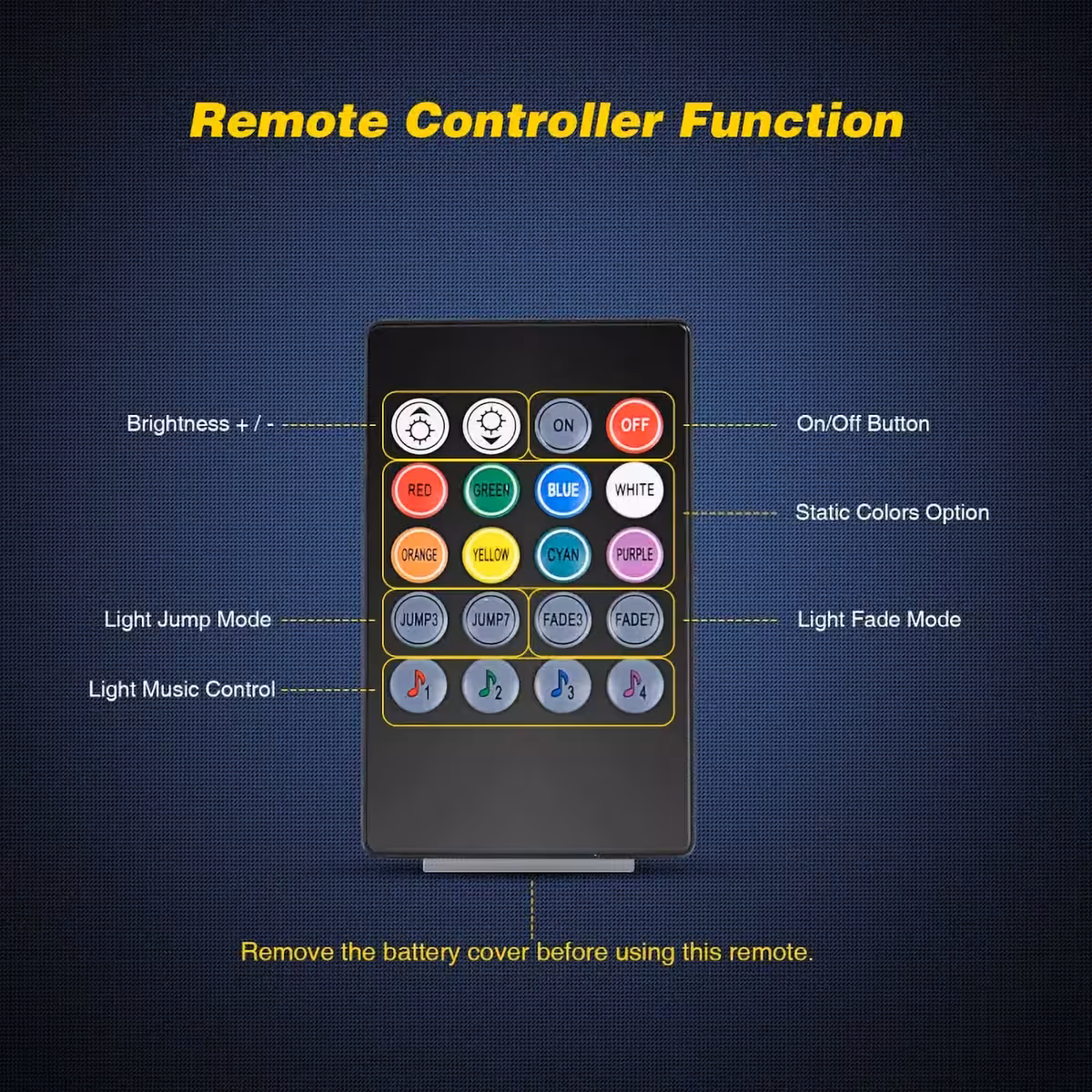 - Daljinski upravljalnik z 8 SMD RGB barvami in možnostmi nastavitve svetlosti.