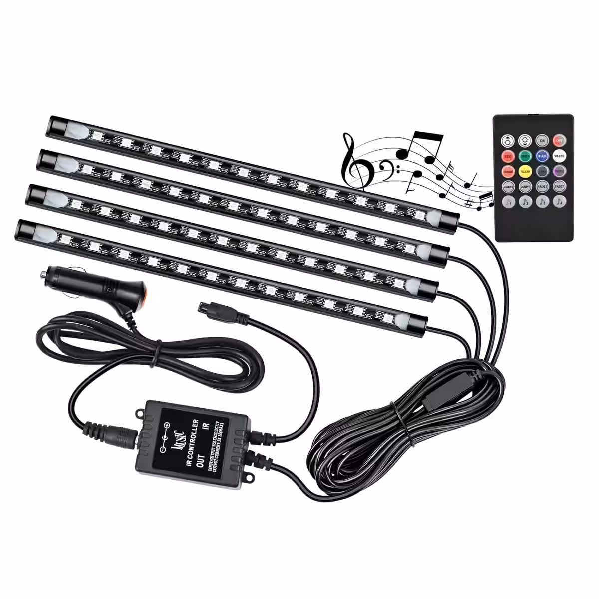 Komplet vsebuje 4 LED trakove RGB, vsak dolg 22 cm (12 LED diod na traku), opremljene s 3M samolepilnim trakom za hitro in varno montažo v notranjosti vozila.