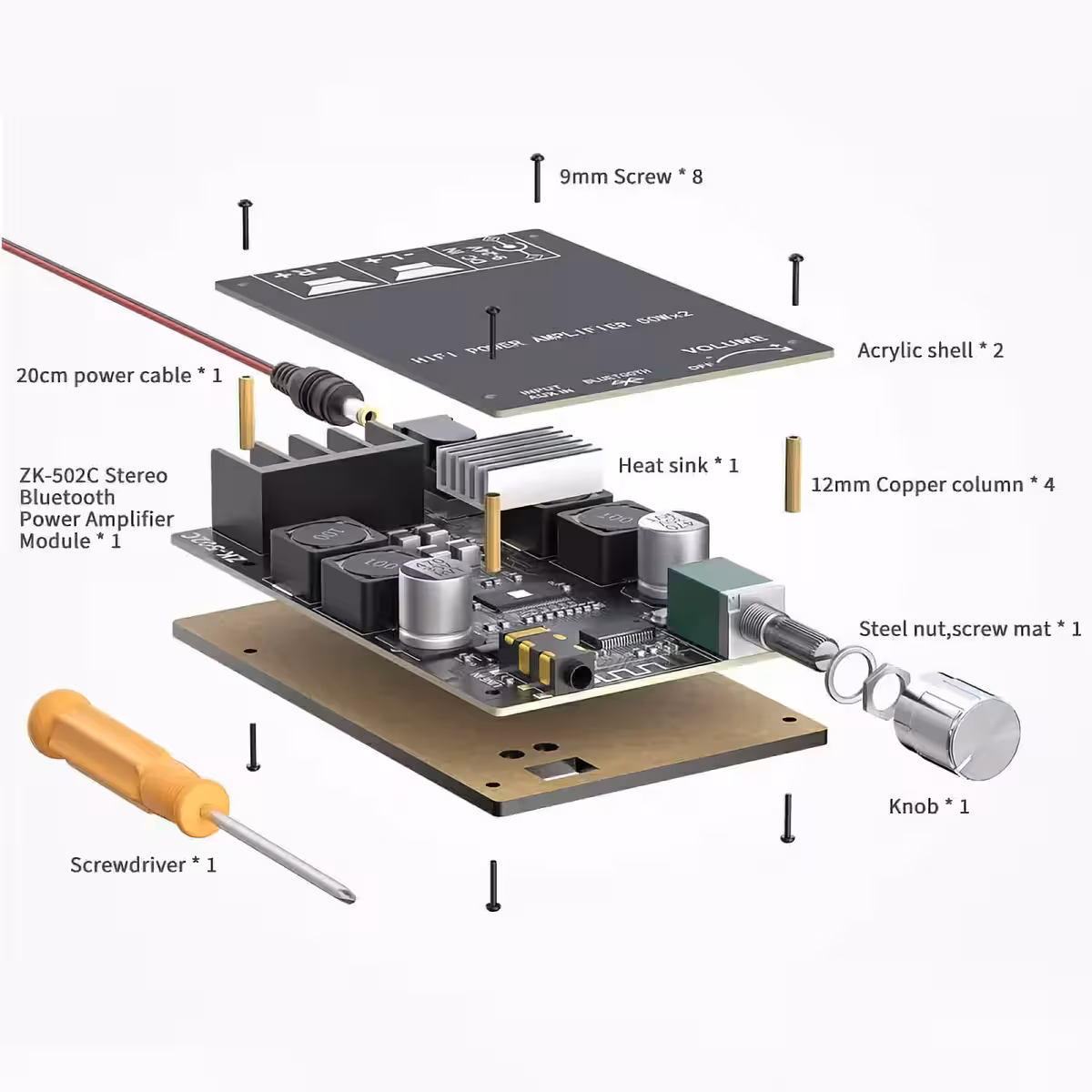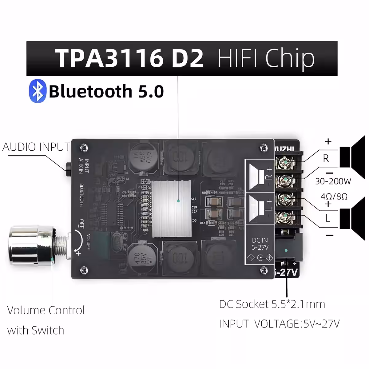 Ta modul združuje učinkovitost 2x50W razreda D ojačevalnika s fleksibilnostjo brezžične povezave. Glasbo lahko predvajate preko Bluetootha ali z 3,5 mm avdio vhodom, popolnoma združljiv z pasivnimi zvočniki 4–8 Ohmov in 50–200W.
