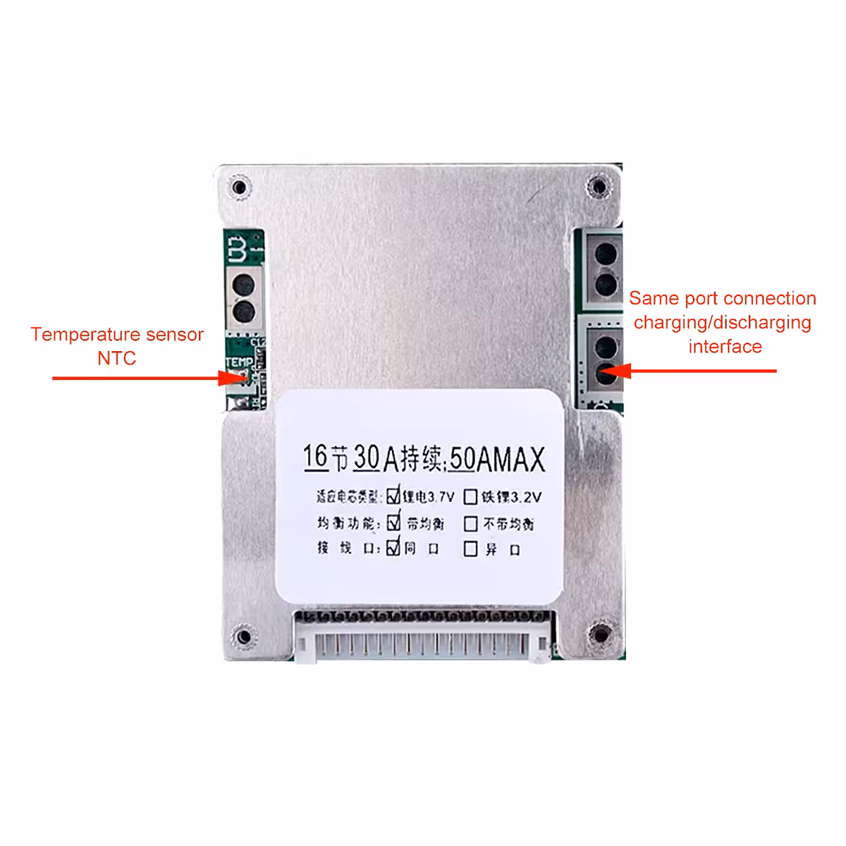 Ta BMS (Battery Management System) 16S 60V je zasnovan za zaščito in upravljanje Li-ion baterij, ki se uporabljajo v električnih skuterjih, električnih mopedih, električnih kolesih ali drugih aplikacijah z baterijami do 2500W. Ponuja večjo varnost, vzdržljivost in inteligenten nadzor napetosti in toka.