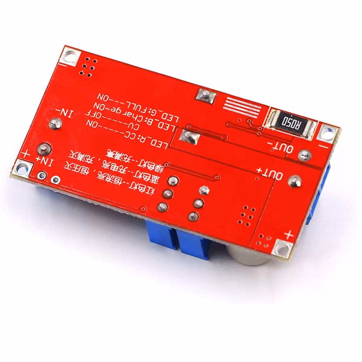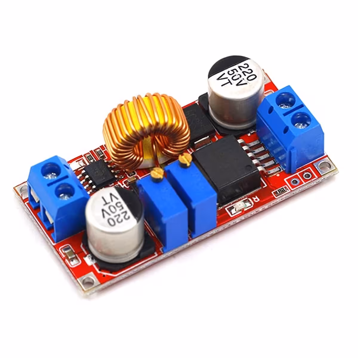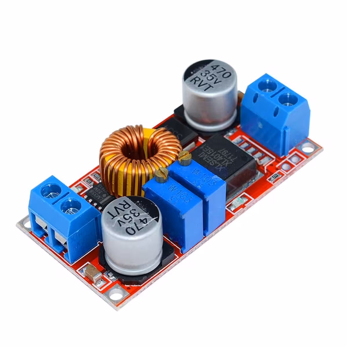 Modul XL4015 je visoko učinkovit DC-DC step-down pretvornik z nastavljivim izhodom med 1,25V in 36V ter tokom do 5A (priporočeno max. 4,5A za dolgo življenjsko dobo). Podpira nastavitve napetosti (CV) in toka (CC), kar je idealno za polnjenje baterij ali napajanje LED diod.